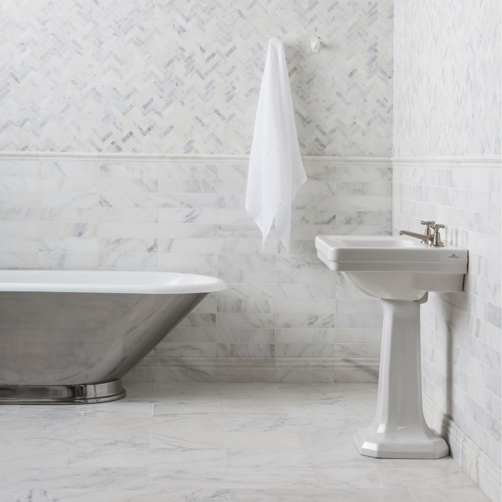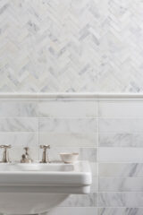 A timeless white/grey marble, Alsace Honed Marble is offered here in the ever-popular Herringbone Mosaic tile format. Complete the look with the Alsace base tiles and complementary mouldings.