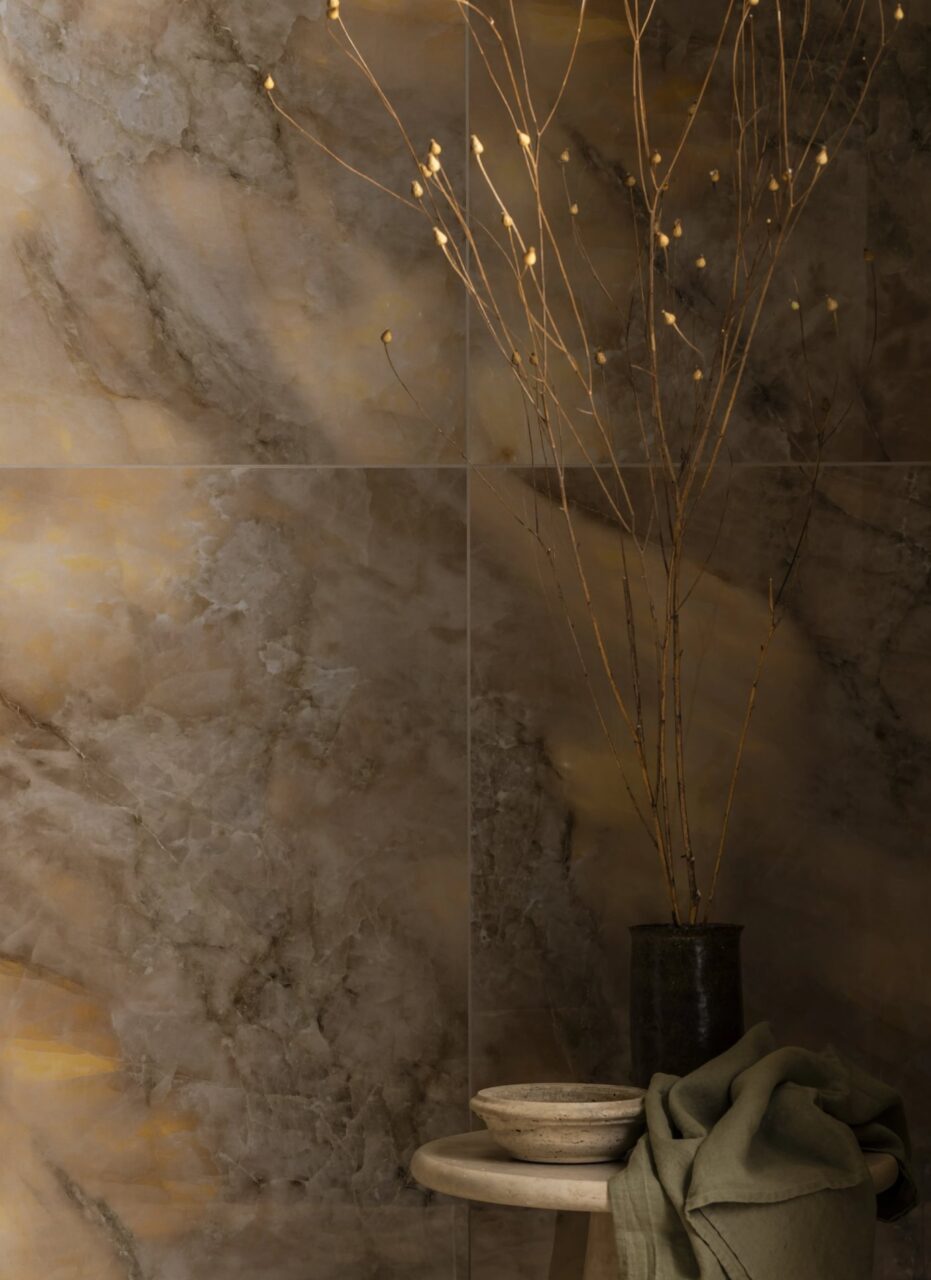 An onyx effect gloss porcelain designed to mimic the translucent, layered beauty of natural onyx stone. Tones range from warm golden honey to deep caramel with variations, movement and veining that expertly imitate the organic look of true onyx. The high gloss finish gives a sleek, polished surface that catches the light beautifully and adds depth. The large format size of 1200x600mm reduces grout lines and contributes to a more seamless, expansive look, ideal for modern interiors and luxurious spaces.