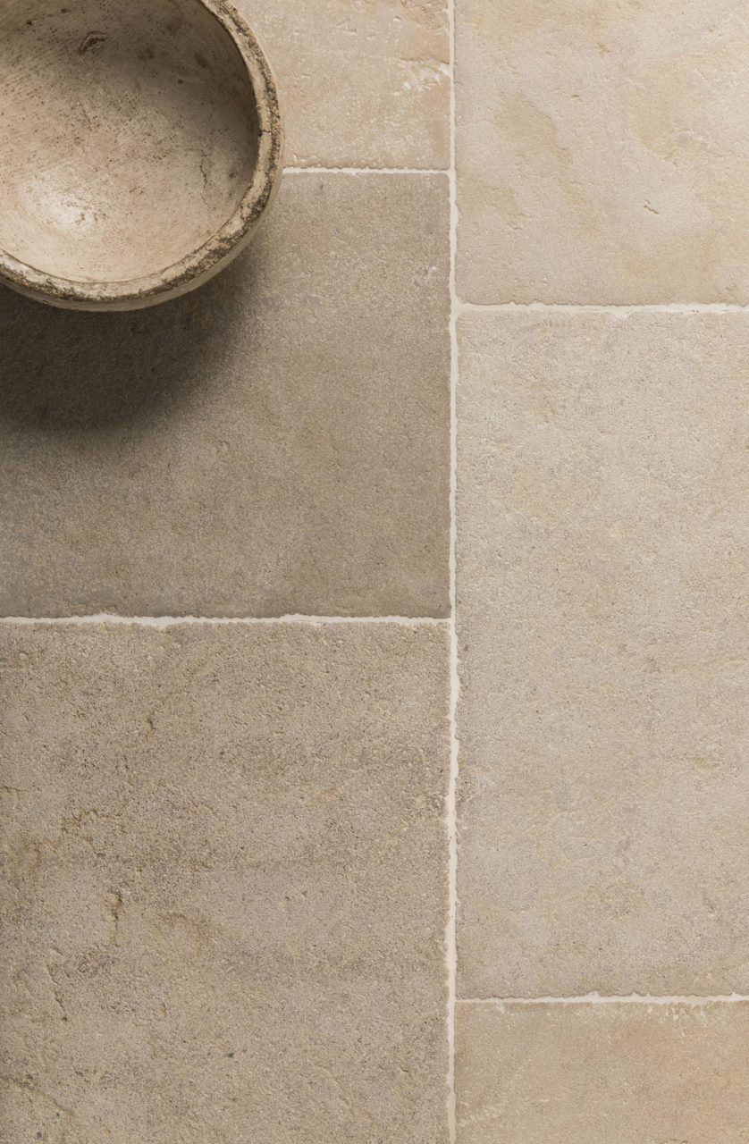 A traditional, reclaimed looking limestone floor that mixes linen tones with subtle greys and warmer shades. The deliberately imperfect surface is hand-worked to give the appearance of a time worn floor.