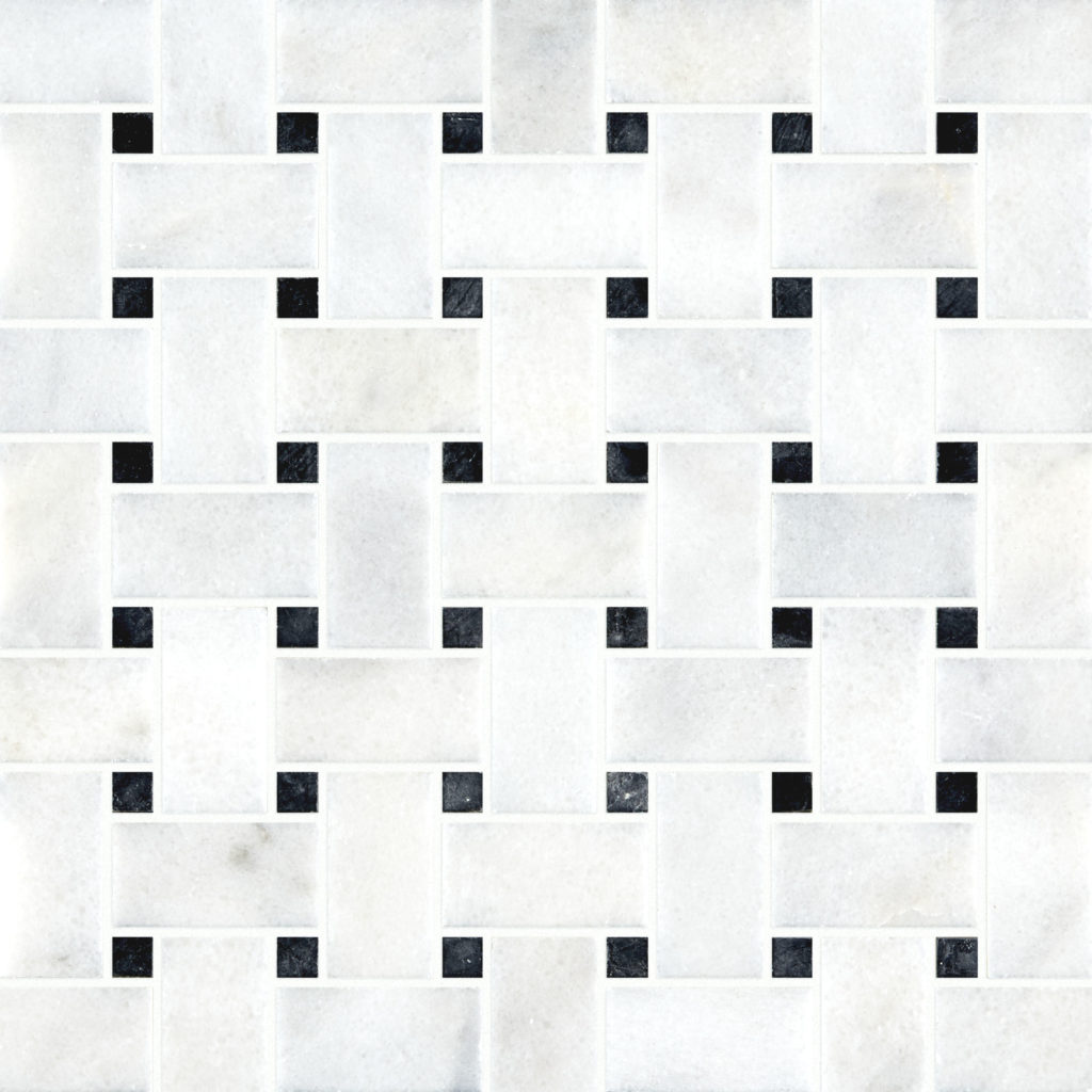 Calacatta marble tiles are a stylish and cost-effective white/grey marble available in numerous formats and finishes. This basketweave marble mosaic tile is perfect for both walls and floors, offering a timeless choice.