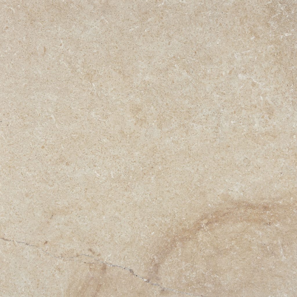A soft peach-grey shaded Campione Tumbled Limestone tile with scattered shells and minerals. An authentic looking stone that suits many situations.
