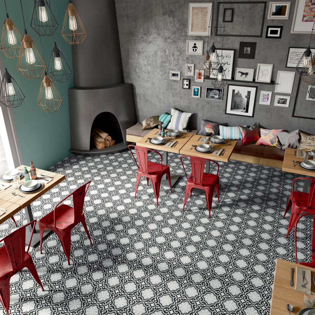 Inspired by traditional Victorian patterns with a Moroccan vibe, our charming Freya Décor 2/6 Porcelain Tile offers a vintage flooring feel. These dramatic encaustic black and white tiles, softened by grey used in the pattern, create intrigue in hallways, porches, kitchens and bathrooms. These practical porcelain tiles are also suitable for walls as well as flooring.