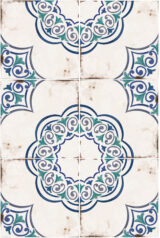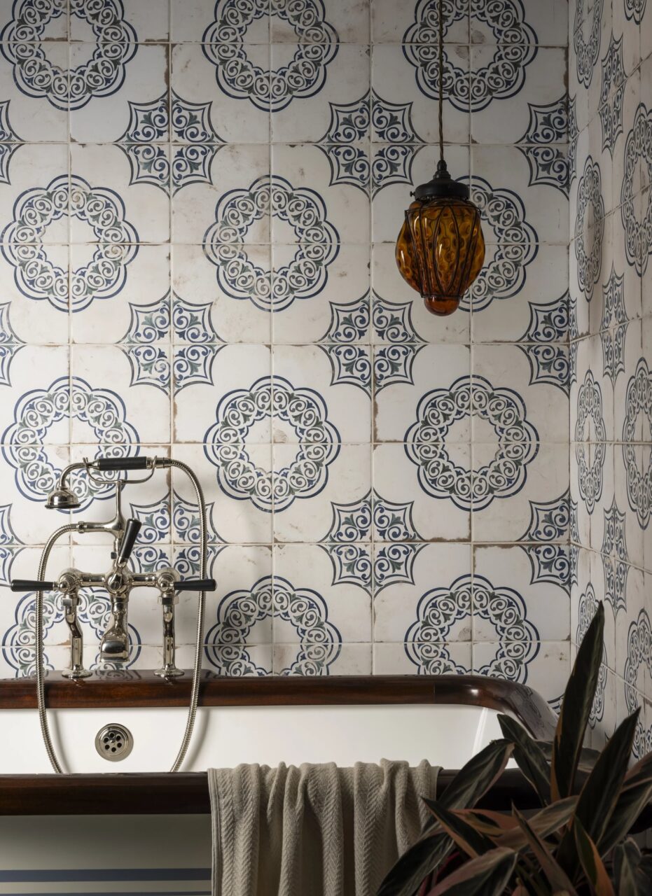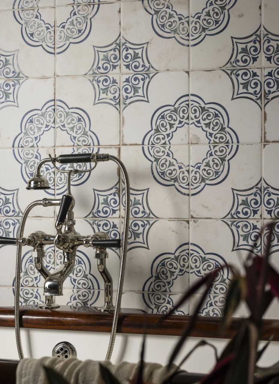 A beautifully detailed patterned tile with an abundance of vintage charm. The colour palette combines soft off-white tones with rich navy and hints of muted teal too. A subtle ageing effect adds to the authentic, time worn appeal, perfect for creating a heritage inspired look.