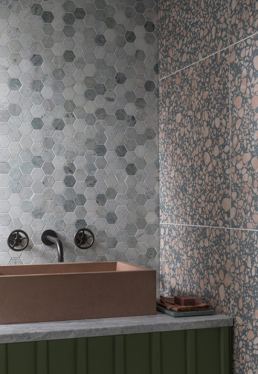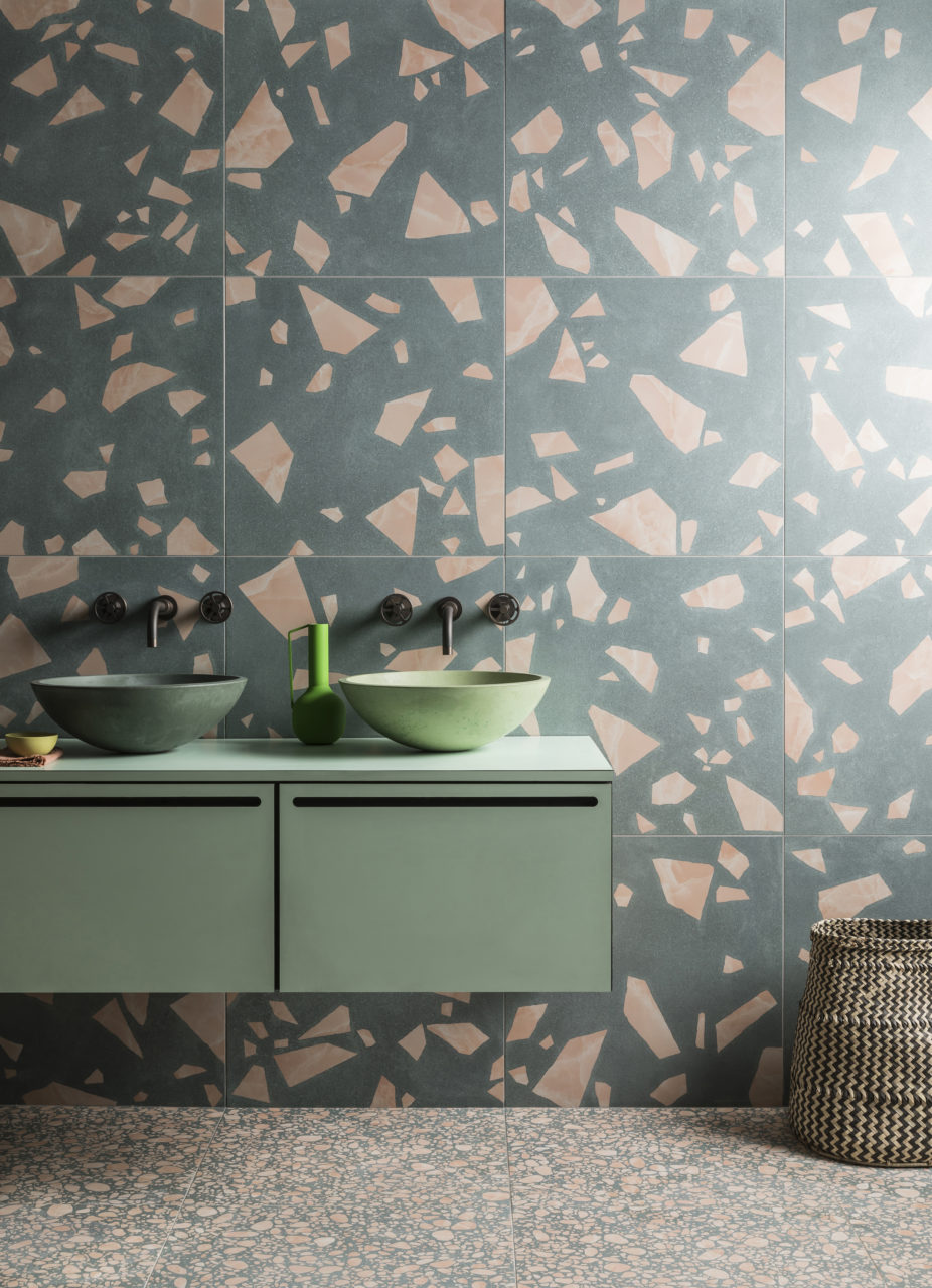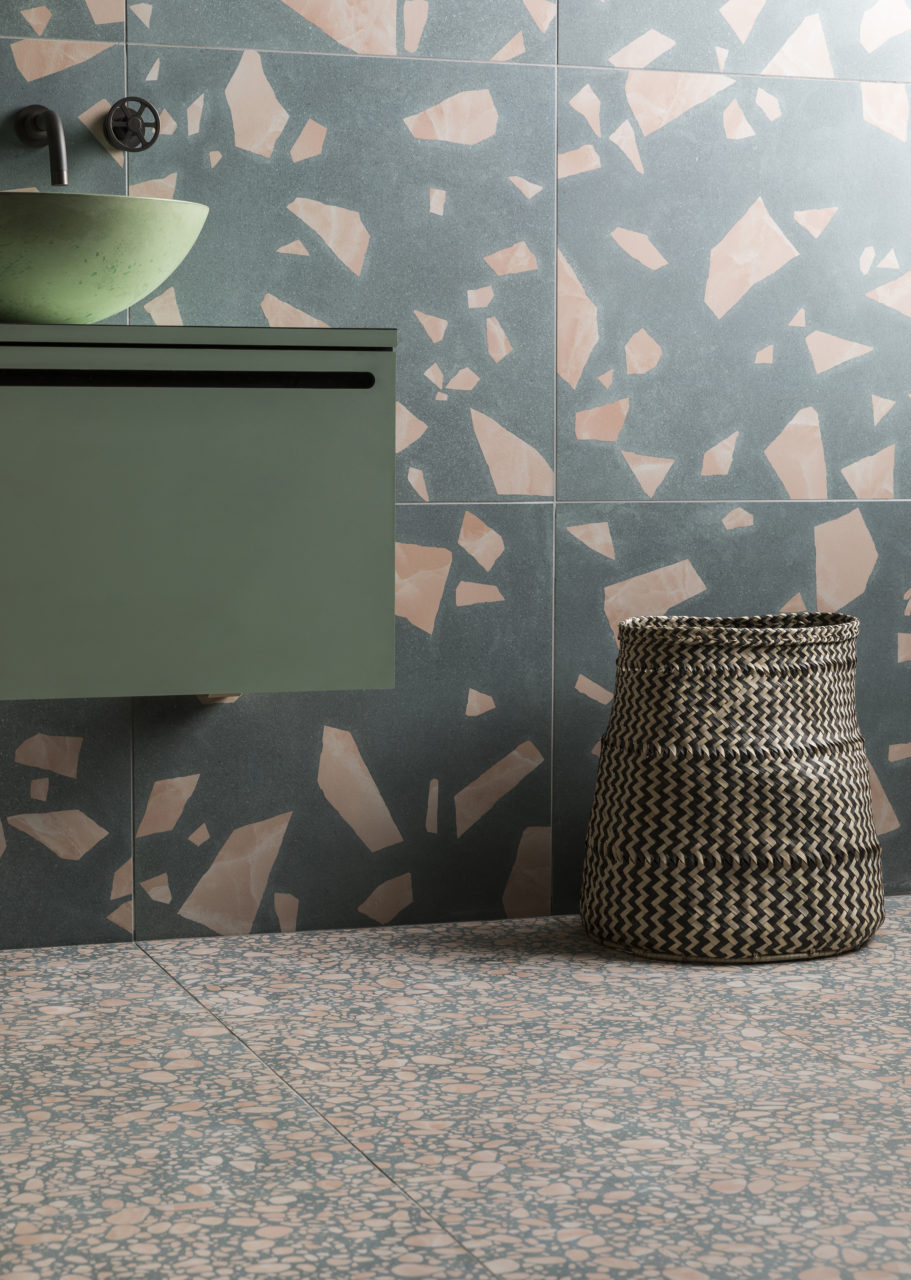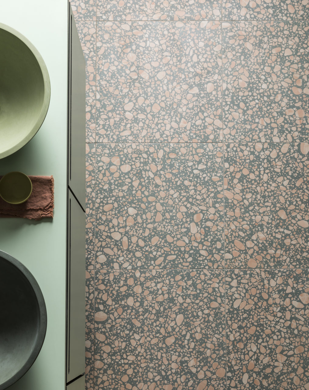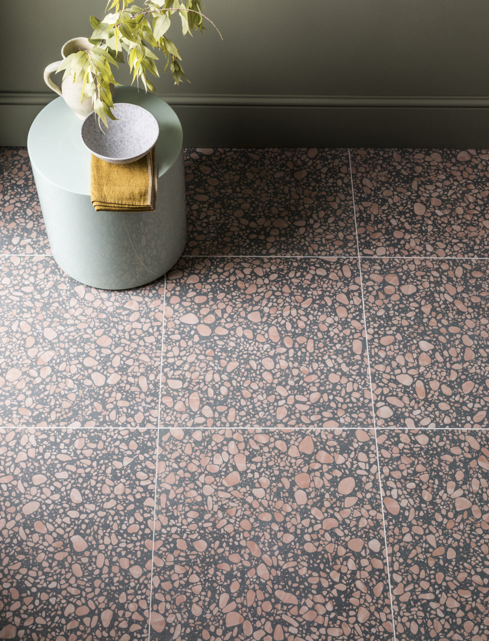 All products within the Pebble terrazzo effect tile range are rectified porcelain floor and wall tiles.