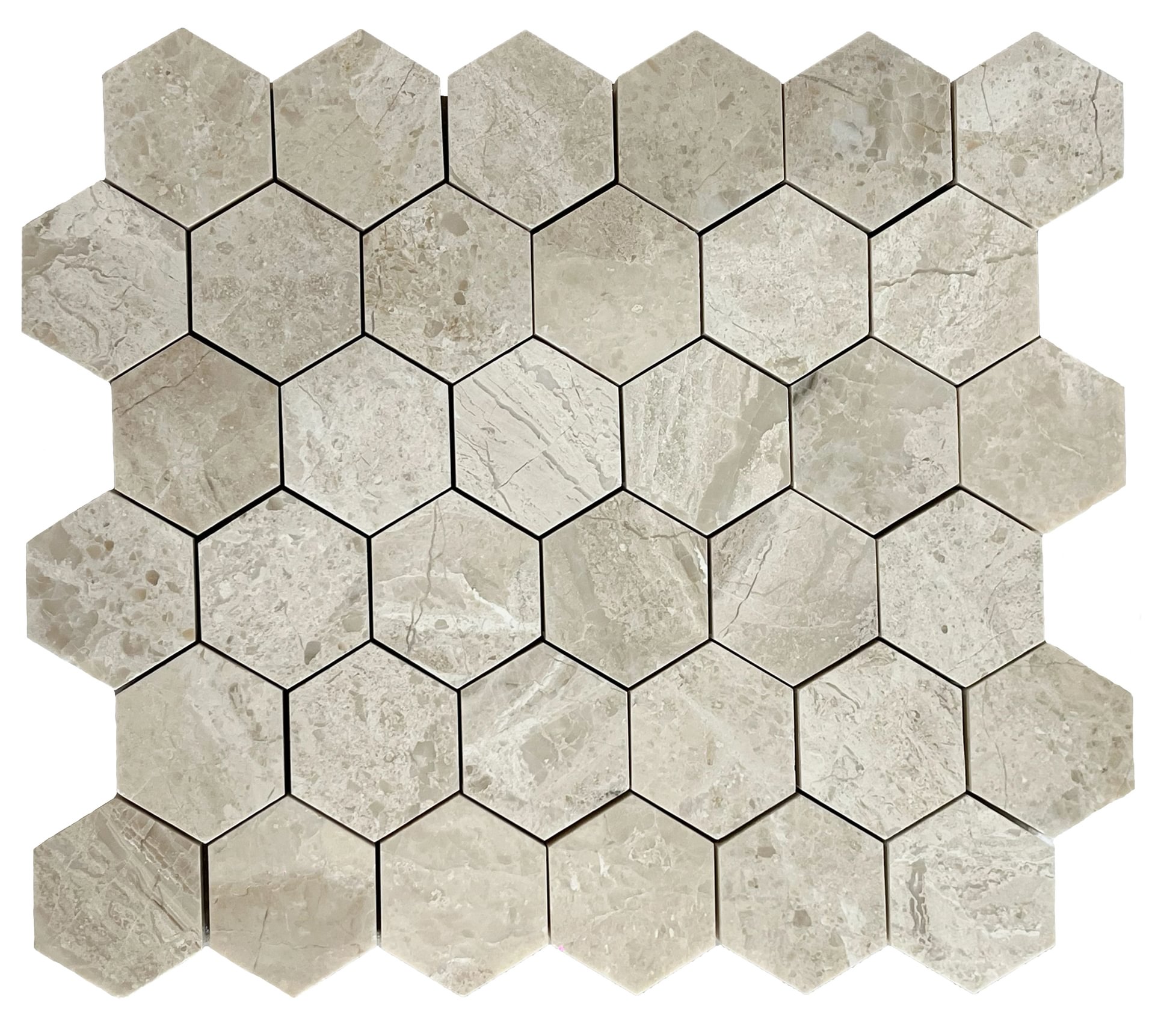 Royale Honed Marble Hexagon Mosaic offers a contemporary interpretation of a classic natural stone. Featuring a soft beige to creamy base with refined linear and cloud-like veining in subtle tones of grey, taupe, and light brown, the hexagon format adds visual interest while maintaining a calm and balanced aesthetic.