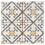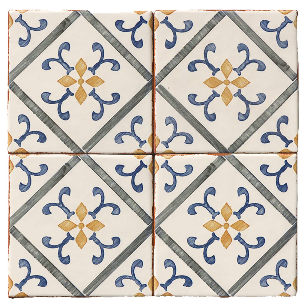 Inspired by traditional European ceramics, Talia Mia blends classic elegance with a handcrafted feel. This terracotta-based tile features a central floral pattern in warm ochre, framed by sweeping blue flourishes and fine charcoal-grey linework that gives a subtle sense of structure.