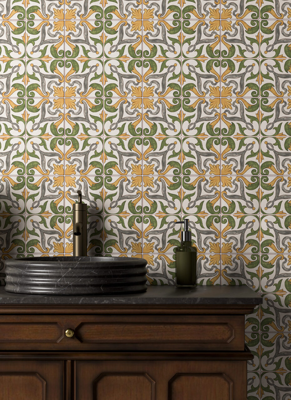 The matt finish, slight sizing variation and worn edges give each tile a gently weathered look, echoing the character of traditional, hand-decorated ceramics. Perfect for feature walls, kitchen splashbacks or bathroom accents, Talia Orla brings colour, pattern, and heritage to any wall space.