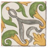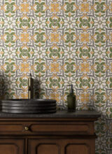 Full of artisanal charm and Mediterranean flair, Talia Orla showcases a flowing botanical pattern in rich, hand-painted tones. Bold green leaf motifs curl around soft golden flourishes and charcoal-grey stems, all set against an ivory, aged base that enhances the hand-crafted appeal.