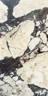 Not for the faint hearted, this striking and eye-catching marble has pale, white/ivory fragments which are interspersed with deep purple, brown & green veining.